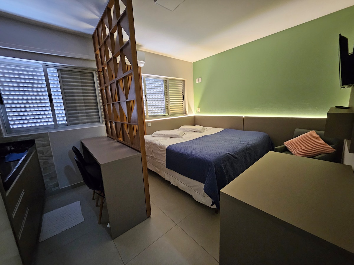 Sinta a beleza e encanto neste estúdio recém decorado com tudo o que precisa, tranquilidade e bem localizado, acomoda até 2 pessoas. Perfeito para casais ou solteiros a lazer ou trabalho. Fechadura digital. Ar Split frio, LED para descanso. Vaga de garagem. Portaria 24 horas. Pode ser preparada cama de casal king (ou duas camas solteiro), informar na reserva. Próximo do Central Park, Catedral e de mercados, bancos, clínicas e hospitais. A 20 min aeroporto. Muitas opções de restaurantes e bares.
