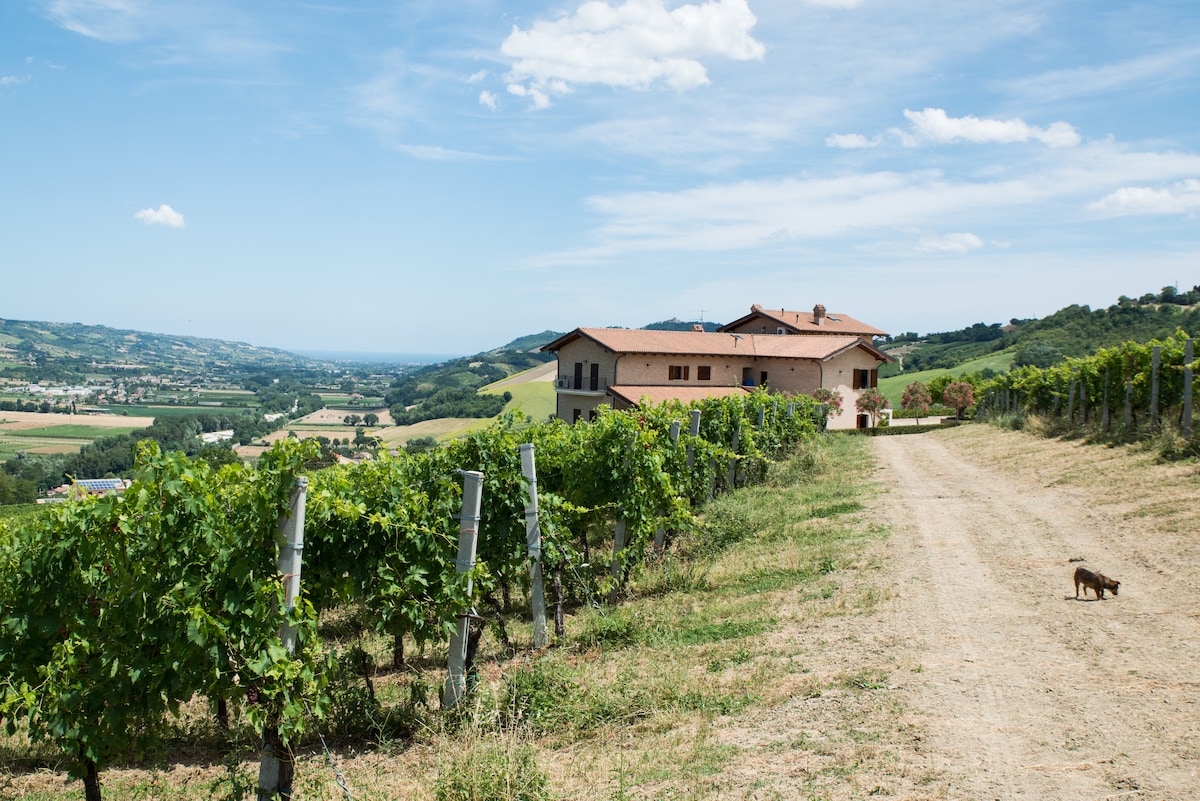 Sprostite se v tem mirnem in elegantnem prostoru z neverjetnim pogledom na morje, hribe Marche, gore, ki se nahaja v velikem oljčnem nasadu. Hiša je dostopna in ima 2 spalnici: dvojno, eno z raztegljivim kavčem z vzmetnico, ki je izjemno udobna kot zakonska postelja; dve kopalnici, dnevno sobo in opremljeno kuhinjo. Okusno opremljeno in starinsko pohištvo. Idealno za daljša obdobja pametnega dela.