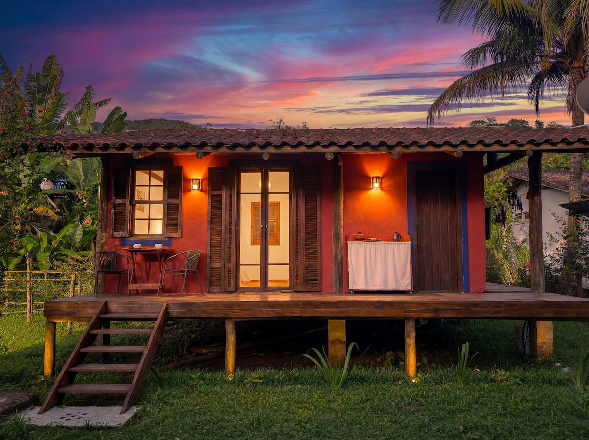 Complete house on a paradisiacal plot of land measuring 7,000m² with 9 other independent and private houses for couples . Casa Árvore has a large bedroom with air conditioning, Smart TV and WiFi internet, a fully equipped kitchen with all the items needed for a perfect stay, bathroom with gas powered shower and hairdryer, and a spacious balcony with a large table and sea views. and to the ornamental garden, facing the natural pool, which harmonizes the environment with the sound of the water!