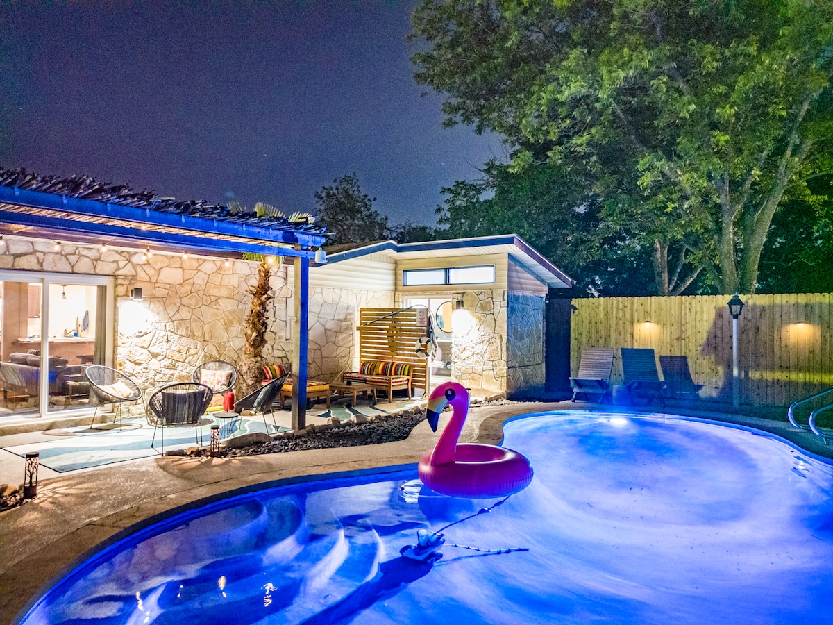 San Antonio se sreča z Palm Springsom. Ustvarite večne spomine v našem udobnem sodobnem prenočišču iz sredine prejšnjega stoletja. Nahaja se v središču mesta in omogoča enostaven dostop do vseh znamenitosti in nakupovanja v tem prijetnem mestu TX. Zasnovano za bivanje na prostem z ogrevanim bazenom, žarom in teraso. Celo majhno zelenico na dvorišču! Elegantno udobje za vašo družino in prijatelje z dvema dnevnima prostoroma, tremi spalnicami in dvema kopalnicama. Vožnja Tesle? Priročno na lokaciji, brezplačno polnjenje.