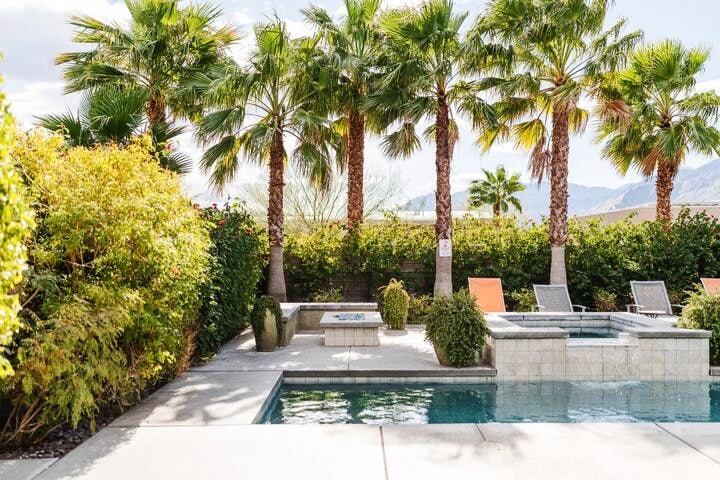 Sunset Palm se nahaja v južnem Palm Springsu, v bližini središča mesta, letališča Palm Springs in sosednjih mest Coachella. Hiša je kot nalašč za dekliški konec tedna, moški golf ali družinske počitnice. Ta 4-sobna kopalnica z 2 kopalnicama ima 4-letni bazen s slano vodo, masažno kad pod paviljonom, 2 ognjišči (ena je propan, druga pa je lesena) in igralnico. Prepričani smo, da boste uživali v na novo nameščeni sodobni zunanji prhi in sodobnem žaru z zunanjim umivalnikom in hladilnikom.