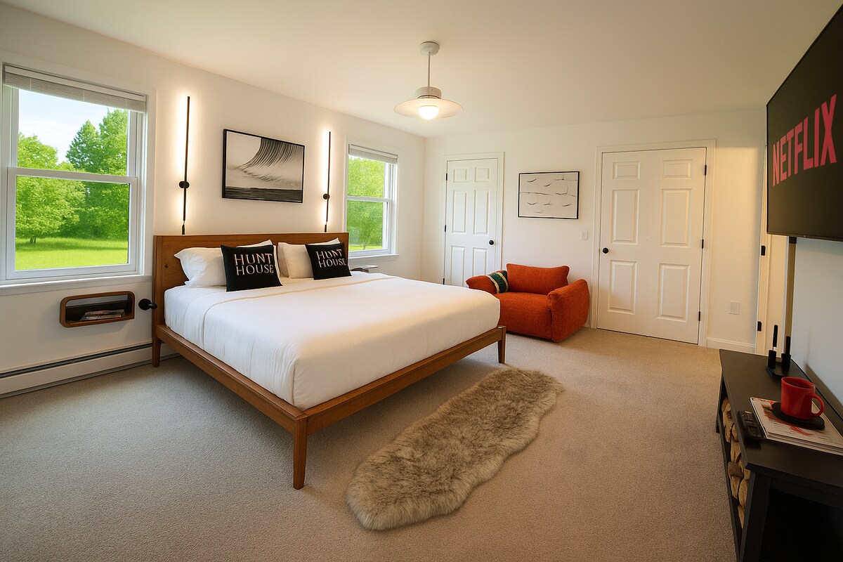 Perched on the water’s edge, you’ll look down from this bright, modern post at an expanse of winding river and broad tree-lined meadows. Let the mellow current and enveloping natural setting satisfy and soothe your senses. This special place is close to everything, making it an ideal launchpad to all the Hudson Valley has to offer. Kingston, New Paltz and Rosendale are all ten minutes away, surrounding you with a plethora of hiking trails, climbing, dining, drinking, entertainment and shopping.
