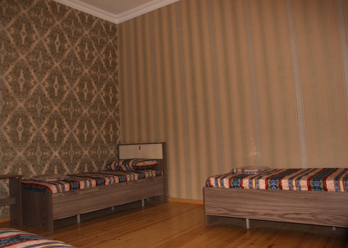Nova hiša za goste z vrtom in verando,s čudovitim razgledom na Jvari in Svetitshoveli,v središču starodavne prestolnice Gruzije - mesta Mtskheta, pred katedralo v Svetitshoveli. Hiša ima 3 sobe z zasebno kopalnico in vso opremo ter eno udobno jedilnico z barsko sobo, kjer lahko uporabljate kuhinjo, če želite. Poleg treh sob na vrtu je na voljo tudi nova klimatizirana hiška na deželi z majhno kuhinjo in kopalnico. Prijazni gostitelji govorijo rusko in angleško.