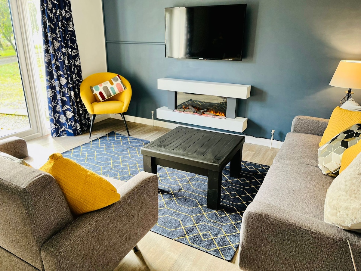 *Bookers must be over 27. For large group bookings, all guests must be over 27. ID is required* (Not applicable to families and children) This house is a luxury 4-bedroom, 2-bathroom self-catering lodge in the Corrstown Village holiday resort. It sleeps up to 8 guests & blends converted stable charm with contemporary comfort. Spacious open-plan living, dining & fully equipped kitchen make it great for groups or families, plus there’s a private garden & outdoor hot tub.