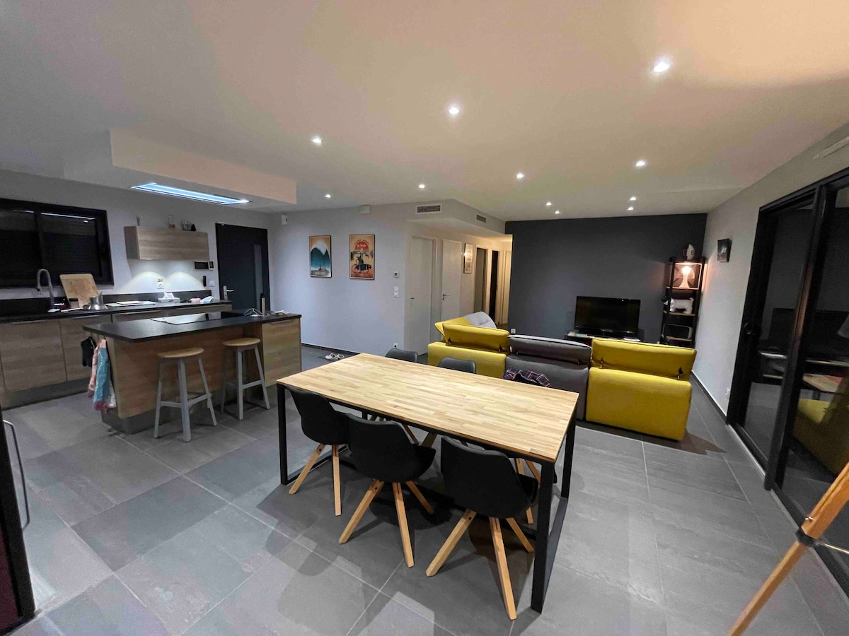 Nova hiša velikosti 45 m2 s teraso za uživanje hrane zunaj ali sprostitev in sončenje. Vrt velikosti približno 80 m2 je zelo lep v sončnih dneh. Popolnoma je ograjeno. Ta hiša je opremljena z vsemi potrebščinami za prijetno bivanje. Sprejme lahko od 1 do 4 osebe. Idealno za družino ali dva para prijateljev. Parkirišče je na voljo tik pred enoto. Vaše vozilo bo tam varno. Aparat za kavo Tassimo.