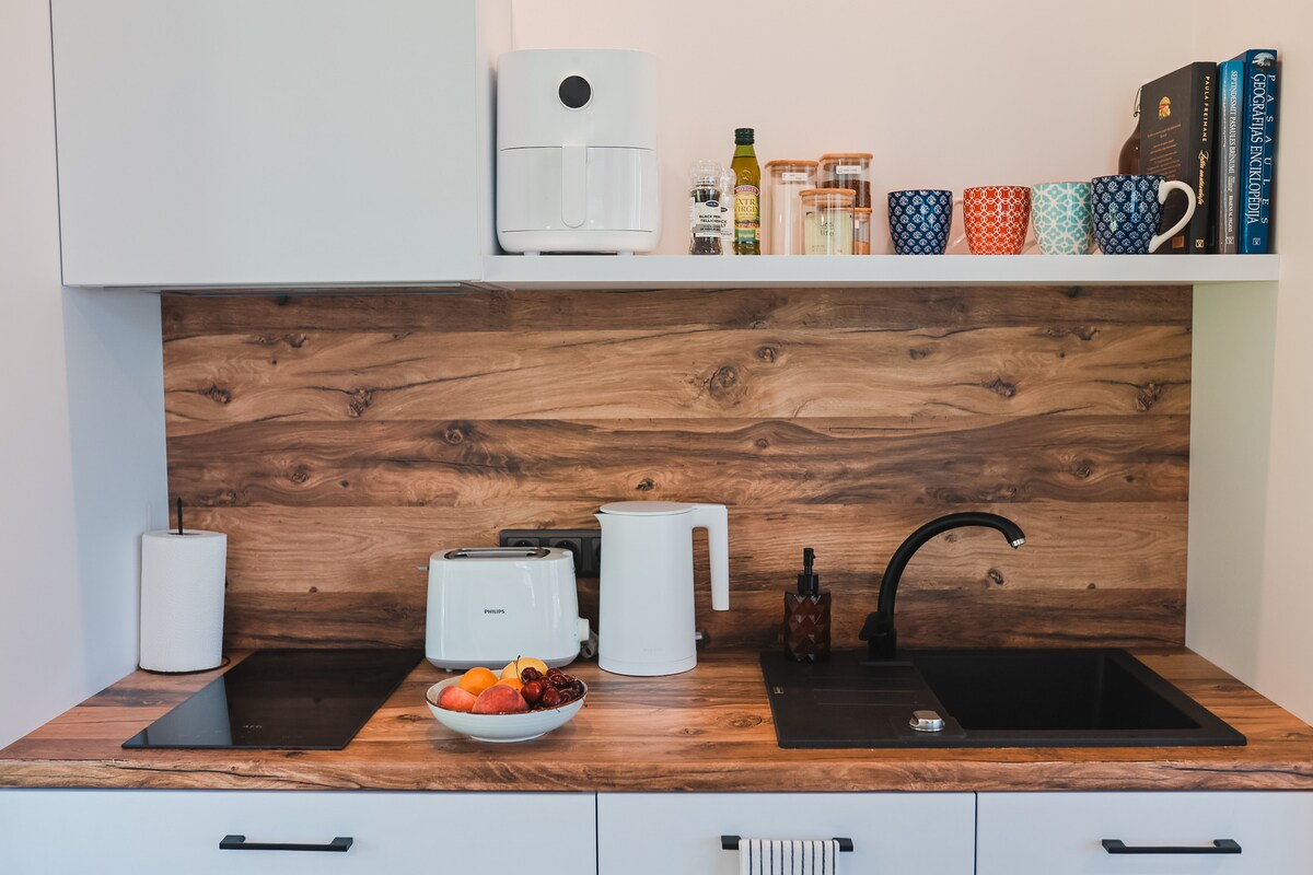 Dobrodošli v našem elegantnem, sveže prenovljenem stanovanju v osrčju Jelgave! Idealen je za pare, popotnike, ki potujejo sami, ali majhne skupine. Ponuja sodobno udobje in priročnost. Uživajte v prostorni zakonski postelji, raztegljivem kavču, pametni TV in popolnoma opremljeni kuhinji z brezplačnim čajem in kavo. Z vsemi osnovnimi potrebščinami in restavracijami, trgovinami in znamenitostmi v bližini boste imeli vse, kar potrebujete za udobno in nepozabno bivanje.