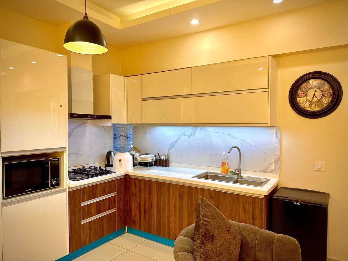 🛏️ King Bed & Private Balcony with Giga view. 📺 55” Smart LED & 30 Mbps WiFi. 🍽️ Modern kitchen with premium appliances. ❄️ Inverter ACs & 💨 automatic air-fresheners. 🔐 Digital locks & elegant décor. ⚡️Electricity Back Up 24/7 🔋 🏙️ Above Zeta Mall, steps from Giga Mall. 🌄 City & hill views. Perfect for families, couples & corporate guests. 🪪 CNIC required (18+). 🚭 No smoking/events. ✅ Book now for luxury & serenity.