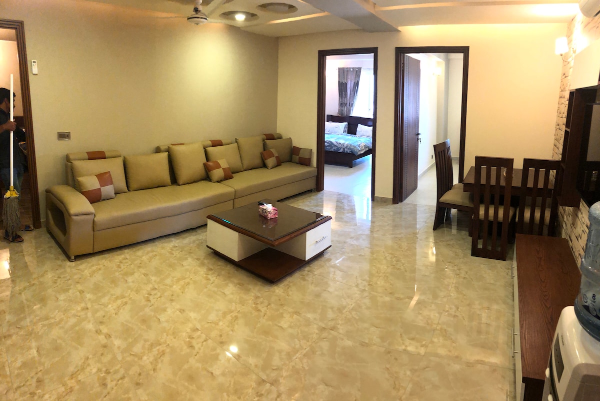 Dobrodošli v tem skromnem, a udobnem in živahnem prostoru. Nahajamo se v novejšem osrčju Islamabada in uredili smo to udobno stanovanje, kot nalašč za pare/ majhne družine/poslovne potnike/turiste, ki iščejo miren in udoben obisk Islamabada. Umetniški koščki bodo vašemu bivanju dodali okus, ki bo sicer miren. Balkon se ponaša z lepim razgledom. Nahaja se v bližini središča Islamabada in mesta DHA ter mesta Bahria, oba konca mesta pa sta v neposredni bližini.