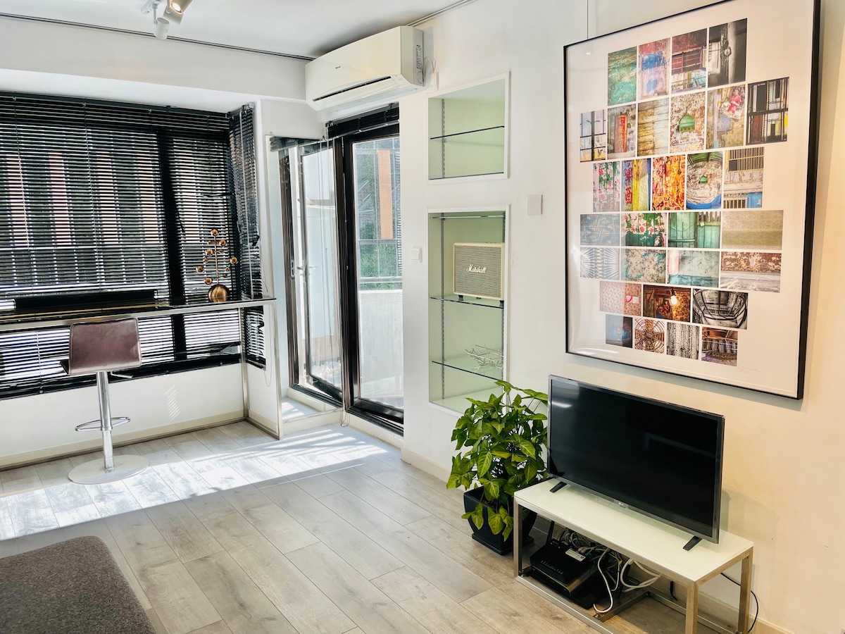 Dobrodošli v našem živahnem prenočišču! Naše stanovanje se ponaša z zasebno teraso z zelenjem za razgled na mesto, srečanja ali žar. Začnite dan z raztegljivo vadbo, ki ji sledi izdelana kava. Z energijo mesta na vašem pragu je raziskovanje prava malenkost. Po urbani pustolovščini se vrnite k miru. Pripravite zrezek na žaru, jedilni al fresco pod našo uro bojevnika v terakoti. To edinstveno, prostorno zatočišče je kot nalašč za pare ali popotnike, ki iščejo nekaj posebnega v Hongkongu.