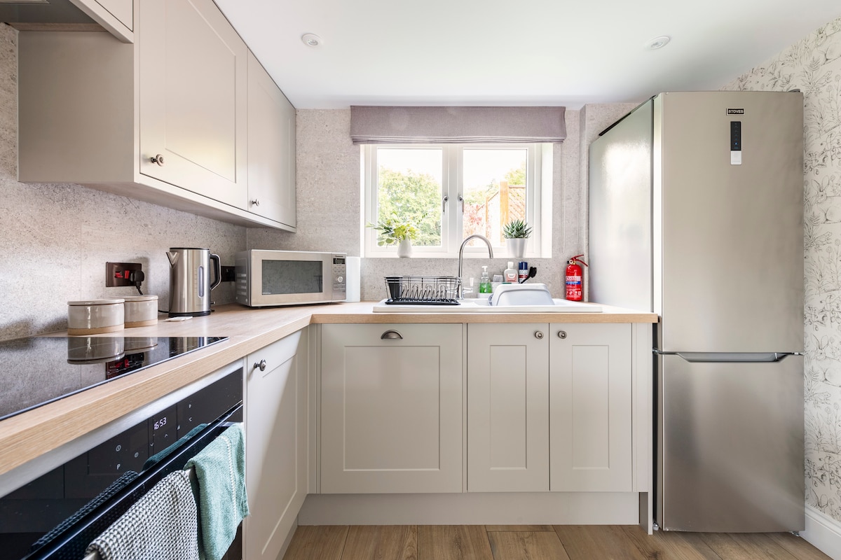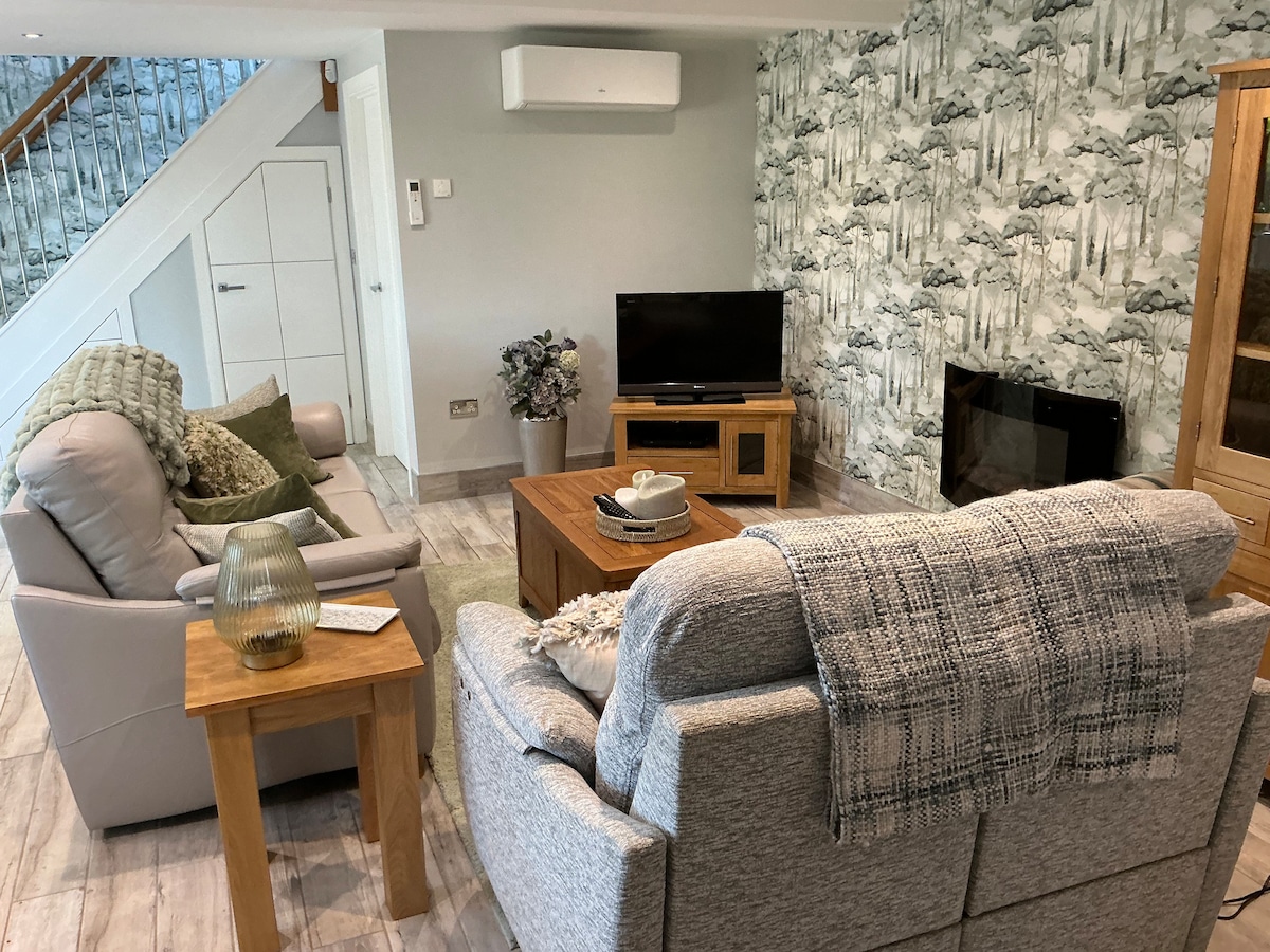 This peaceful countryside location, on the door step to amenities, pubs, walking trails and places of interest is an idyllic getaway with private outdoor balcony roof top garden. Open plan living on the ground floor with fully equipped kitchen. Separate washer and dryer. Downstairs WC. Locked covered bike storage, 1 x King size, 1 x double bedroom on 1st floor. Luxury bathroom with slipper bath. Dedicated workspace w/43” monitor. Two private parking spaces included with EV socket.
