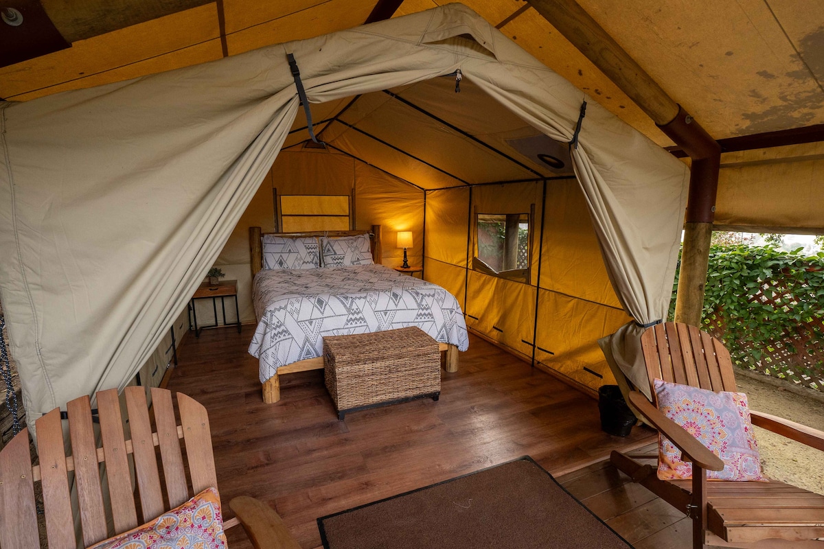 Opremljen luksuzni šotor 3 x 3,6 m z udobno zakonsko posteljo, zunanjimi sedeži, ognjiščem na propan in žarom. Le kratek sprehod vas loči od kopališča, kjer vas čakajo vroče prhe, stranišča in osnovno pomivalno korito. *Šotor je primeren za hišne ljubljenčke in lahko sprejme največ 2 osebi (vključno z otroki).* Doplačilo za hišne ljubljenčke: 50 USD na bivanje Največ 1 hišni ljubljenček, do 14 kg.