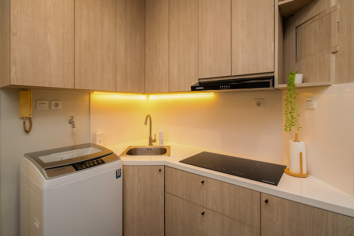 An elegant 24sqm studio in Jakarta's center, blending style and convenience. Includes kitchen, fast Wi-Fi, air-purification, 43" smart TV, sound system and Netflix. It is ideal for various stay types, with contactless access and amenities like pools, jacuzzi, gym, and basketball, Now features a Reverse Osmosis dispenser & food waste disposal, The picture shows a gas stove that has been replaced by an induction cooker (to follow the apartment guidelines for fire hazards)