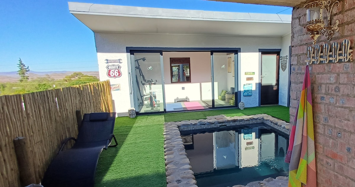 Come home to a unique Karoo-stay experience where bold colours, textures & patterns all form part of a unforgettable time with loved ones. Indulge in true Karoo living where contemporary style meets the old fashioned way of living. The unit consists of two luxurious bedrooms with en-suite bathrooms. Both rooms have king size beds, fine linen & airconditioning, The fully equipped kitchenette, open plan living room & fire place promise to live up to you’re expectations.
