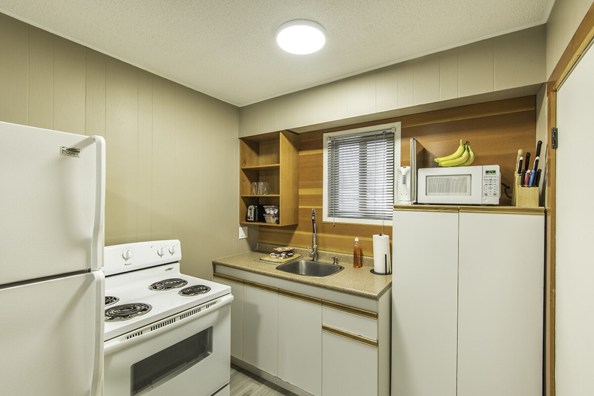 Kodiak is a practical option for guests who want light cooking options without a full kitchen. It includes a queen bed, full-size fridge and kitchen sink with dishes, a hot plate, and a bathroom with shower. With a private patio, BBQ, and air conditioning, it’s well set up for easy, comfortable stays at Christina Lake.