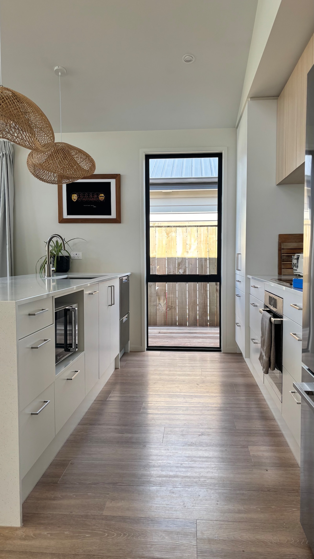 5 year old house with double garage & lovely open plan living area with large deck area. The kitchen is well equipped. It's superbly warm with underfloor heating system & loads of all day sun. The master bedroom has a double shower ensuite bathroom. The other 3bedrooms are either king single or super king beds. In a separate bedroom off the living room are is one fold out bed and king bed or 2 king singles, & king + king single in the master bedroom. The lawn area is well fenced.