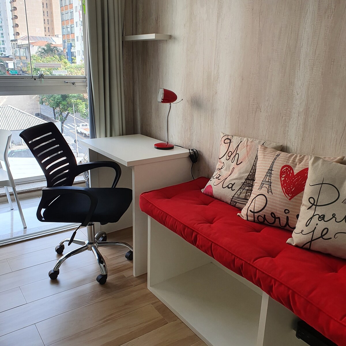 Apartamento inteiro mobiliado, com internet, garagem, PORTARIA REMOTA ( Central de Acesso), local tranquilo, arejado e aconchegante, indicado para "estadias curtas" para pessoa a trabalho ou estudo. O prédio fica uma rua atrás da Praça Cívica (centro da cidade), consequentemente fica perto de tudo. Também fica bem próximo do Bosque dos Buritis e Feira da Lua ( 300 metros). O prédio tem formato de embalagem de pizza então tanto a sala como o quarto tem um formato de trapézio.
