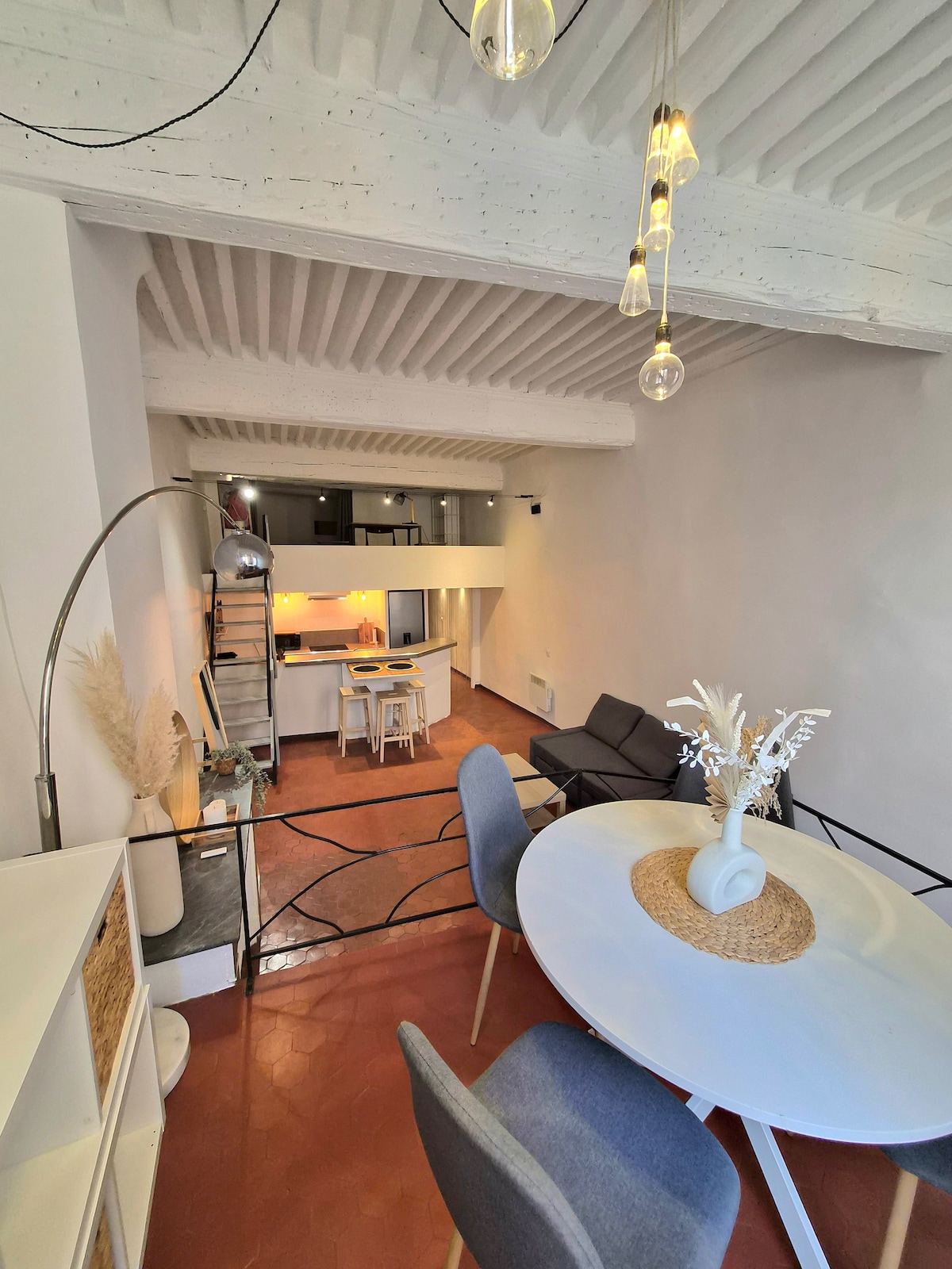 ATELIER MONCLAR**** Logement entier. Loft en duplex open space. Climatisation. Terrasse provençale (couverte). Equipement design. Hypercentre historique d' Aix-en-Provence. 4 étoiles.**** Très calme. Idéal télétravail wifi. 40 m2 environ.2 personnes maximum. Duplex avec espaces décloisonnés, lumineux sous les toits, 3ème et dernier étage (escaliers) plein de charme, calme mais au cœur du vieil Aix animé.