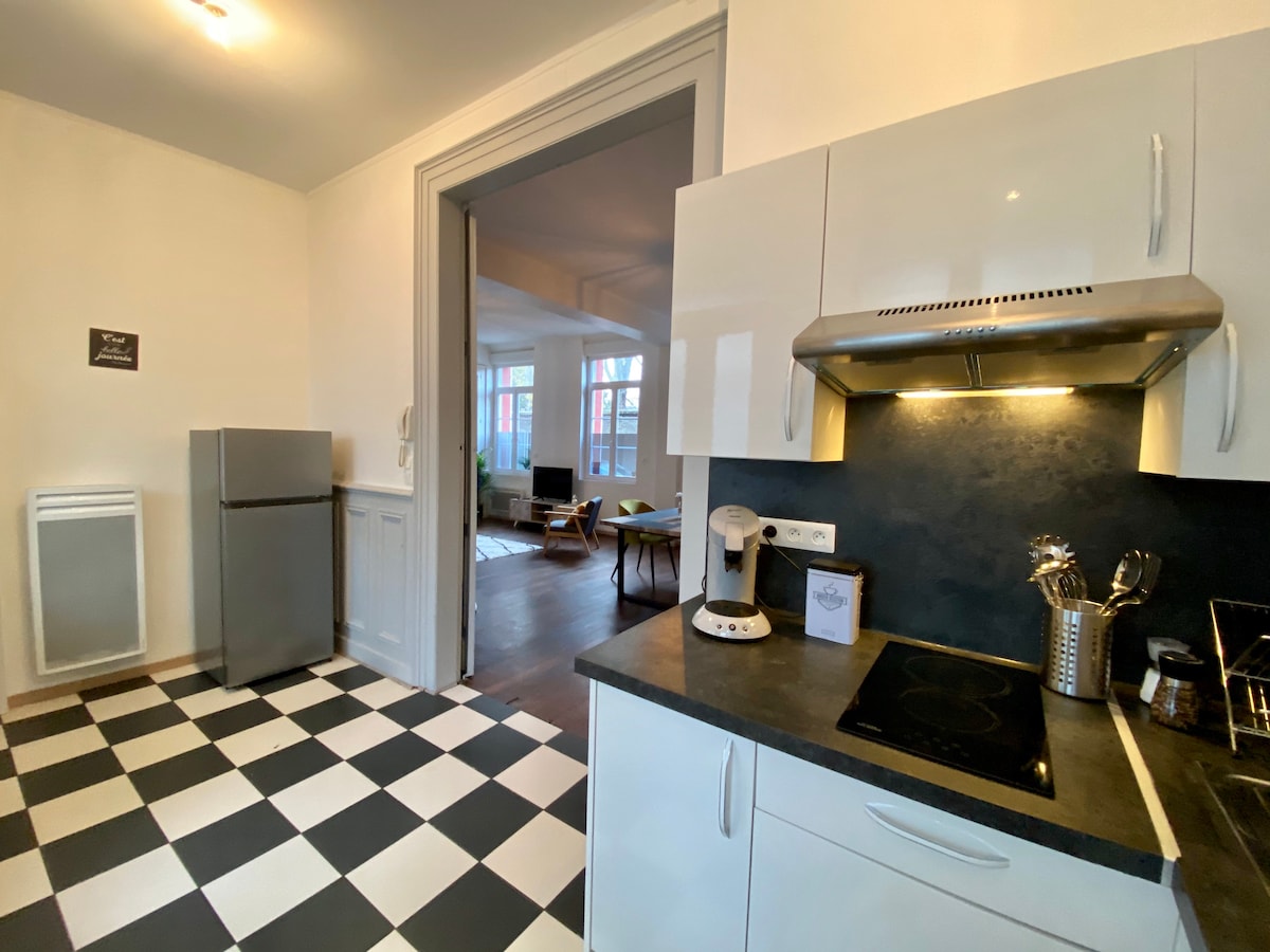 Studio 28 m2, avec jardin, (attention Rbnb annonce 2 lits il n’y en a qu’1 ) entièrement équipé, en hyper centre, à deux pas de la maison de la culture, l’Hôtel de Ville, le Beffroi, la place Gambetta, la Cathédrale, restaurants, bars, Halle au frais, toutes commodités accessibles à pieds! Possibilité de se garer gratuitement à 200 mètres du logement.