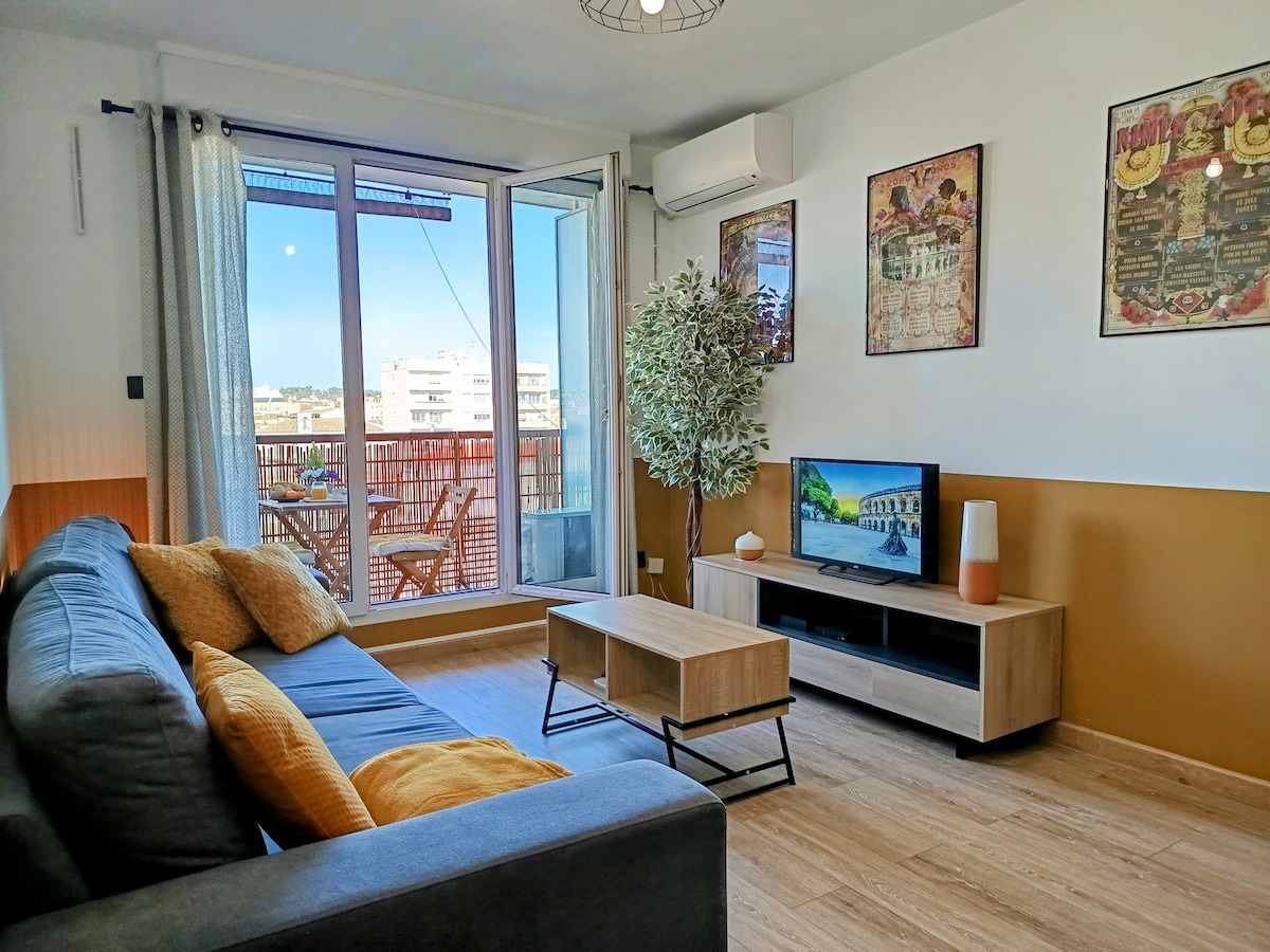 Nîmes je samo vaš! Klimatizirano stanovanje, popolnoma prenovljeno in uživa v zasebni panoramski terasi s pogledom na srce starega Nîmesa. 360-stopinjski pogled na okrožje Ecusson, brez kakršnegakoli pogleda. Manj kot 2 minuti hoje od znamenitega Arenas & Maison Carrée; 10 minut hoje od postaje "Nîmes Centre" TGV in avtobusne postaje.