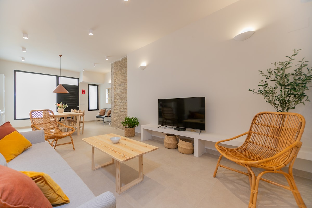 Loft located in the heart of the maritime district of Valencia, El Cabanyal, 5 min. from the Malvarosa beach. House built in 1900 and completely renovated without losing its essence. This stunning apartment fuses traditional architecture with chic boho design in a natural textured setting. Gaze at the high vaulted wood-beam ceilings and exposed brick walls as you dine in the marble kitchen area and cool off in the spacious rain shower.