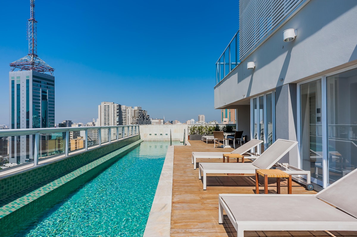 Estúdio espaçoso com muito design, arquitetura e a melhor vista de São Paulo. Loft completo! Com cama queen, closet, ar condicionado silencioso, cozinha completa, home office, WI-FI, TV 55” e uma belíssima banheira de imersão, de onde pode apreciar o seu drink preferido e curtir uma vista apaixonante. São Paulo toda estará há poucos minutos de você. Acesse o metrô andando apenas 200m. Reserve com tranquilidade! Proporcionaremos uma excelente hospedagem e uma ótima experiência!