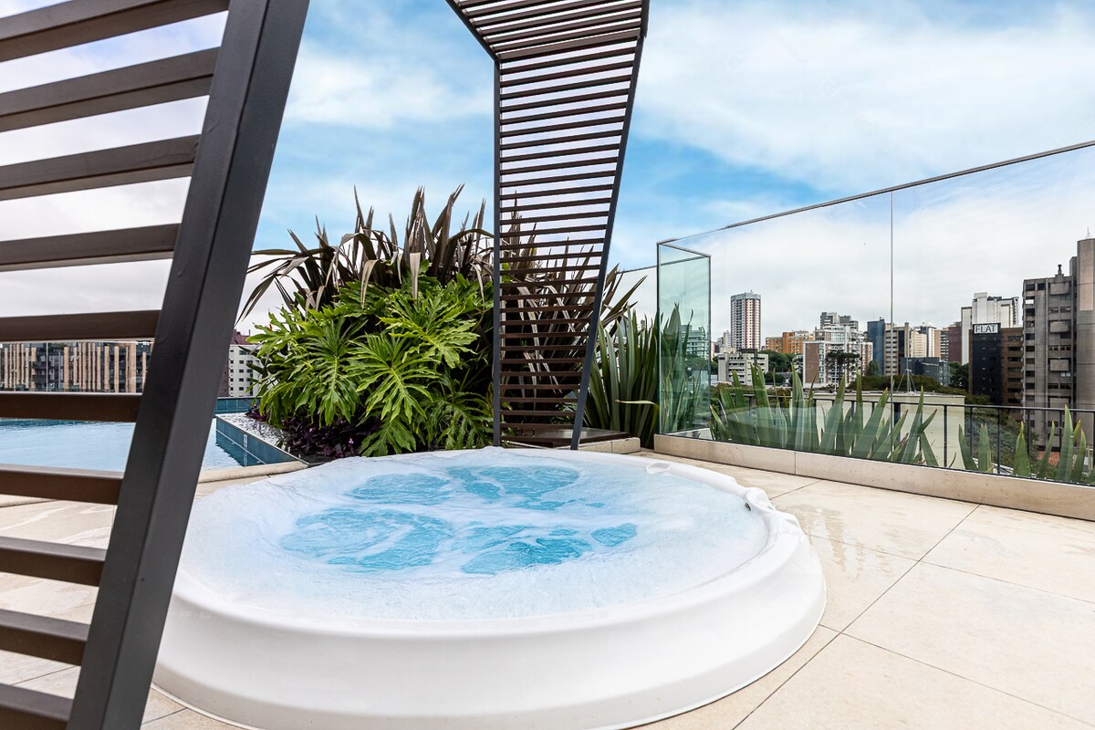 Zatočišče v višavah: udobje, prefinjenost in dih jemajoč razgled. Bivajte v 31. nadstropju stavbe 7 in uživajte v nepozabnem panoramskem razgledu na Curitibo. Stanovanje ima visok standard dekorja, z vsemi pripomočki, zakonsko posteljo in privilegijem uživanja v sončnem vzhodu skozi gore. Udobje, brezhibno čiščenje ter posteljnina in kopalna posteljnina so predmeti izjemne predanosti, ki jih dokazujejo vsi gostje. Na voljo je tudi brezplačno parkirno mesto.