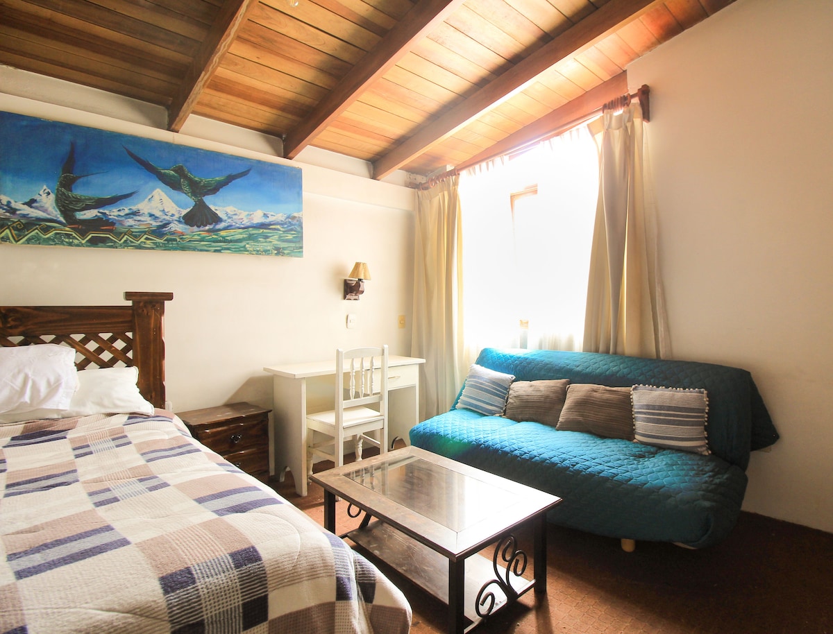 Disfruta de tu estadía en Cusco en esta suite con vista a una de las plazas más emblemáticas y vivas de la ciudad, cerca al centro histórico y al Cusco moderno. Tenemos de todo a un paso, supermercados, restaurantes, cafeterías, bancos, farmacias, clínicas, etc Nota: El espacio está en el cuarto piso y el edificio no cuenta con ascensor (será como su entrenamiento para Machu Picchu,😉)
