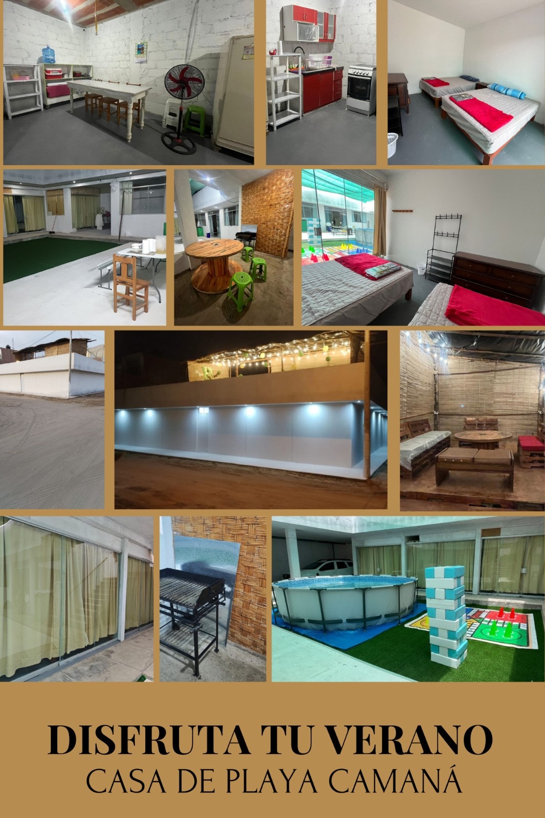 UŽIVAJTE V POLETJU, PREŽIVITE NEKAJ DNI V SOBI Hiša na plaži (popolna) je v najemu in je opremljena z vsem, kar potrebujete za udobno bivanje. Hiša je primerna za 12 oseb, 2 kopalnici s prho, dnevna soba, jedilnica, kuhinja, garaža, bazen. Nahaja se v zasebni urbanizaciji, 4 minute od plaže in 4 minute od trga Plaza de Camaná. *** Zahtevana je garancija ***