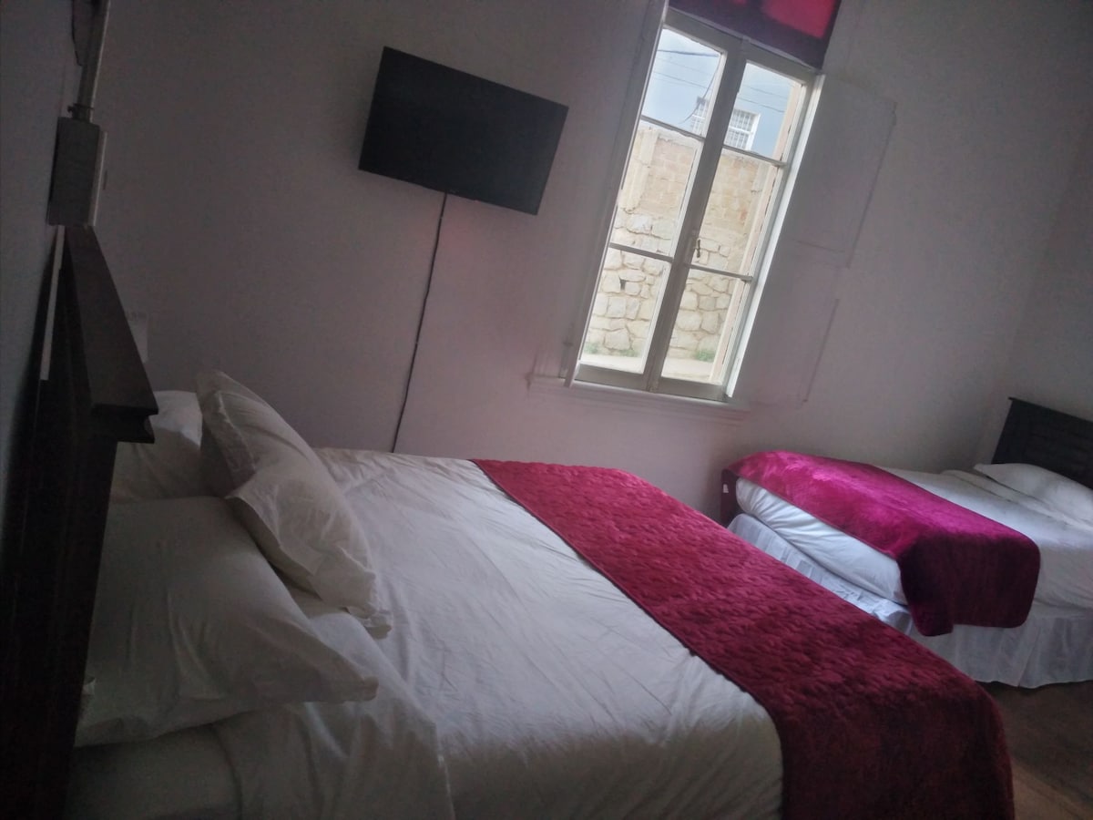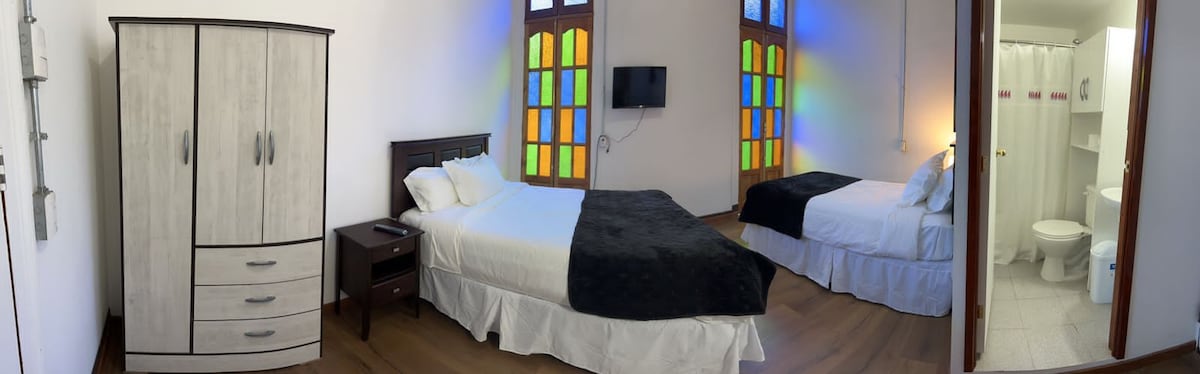 We are located strategically in Cerro Alegre, our house was declared a World Heritage Site. The room of 215 ft2 has a French-style balcony overlooking the main street, king bed, futon, 40" TV, desk, chair and heater. Can be used as a double or twin (king bed + futon). If there are 3 people you have to add an extra person. The bathroom is shared, but you can request a private bathroom outside the room for an extra charge (subject to availability).