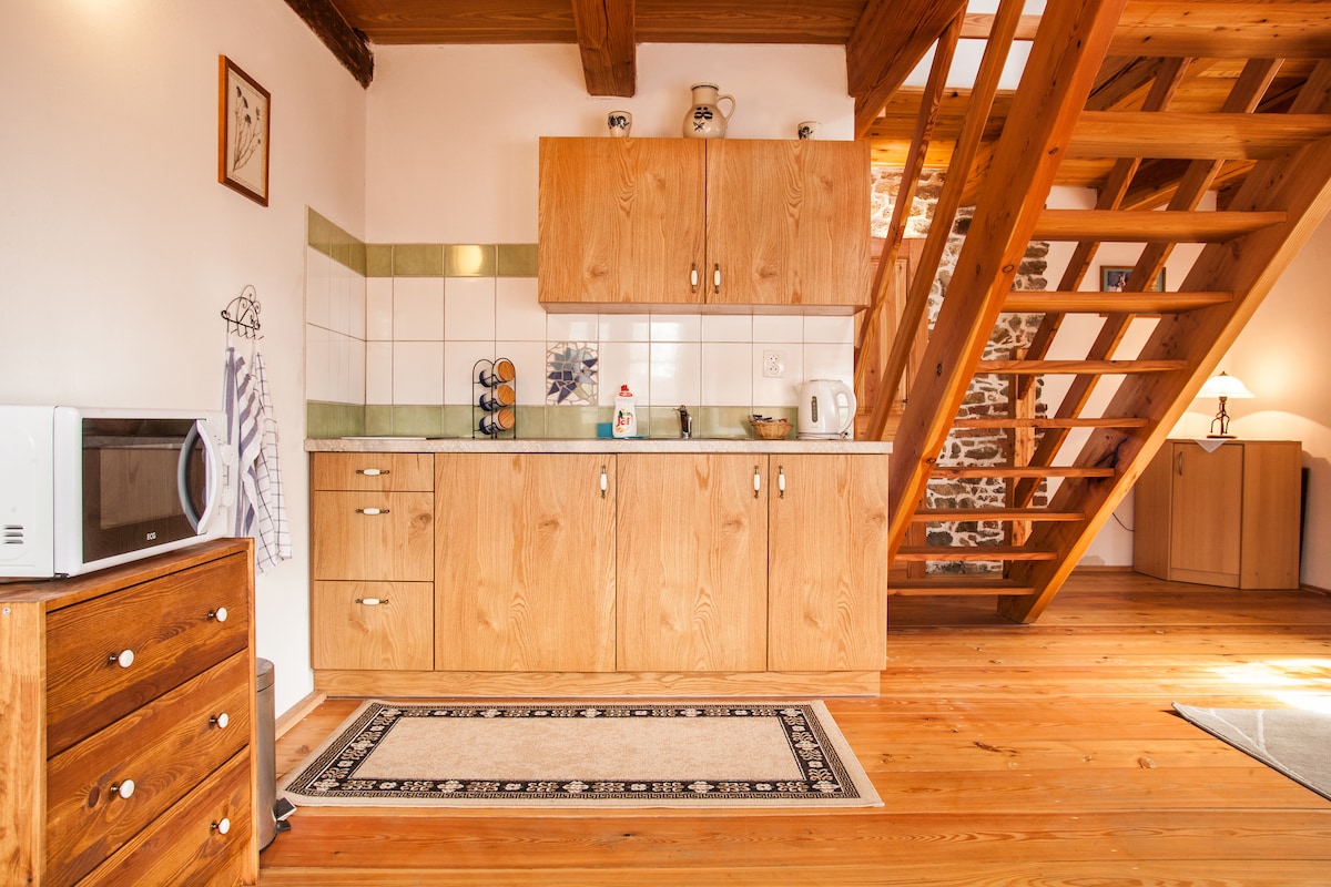 Nudimo nastanitev v na novo obnovljenem apartmaju – prvotno vejminku – na stari kmetiji v bližini vasi Komařice na Južnem Češkem. Kmetija se nahaja na samem ob gozdu, približno 1 km od vasi, v neposredni bližini ribnikov. Apartma se nahaja v ločeni stavbi z lastnim vhodom, kar zagotavlja zasebnost neodvisno od stalnih prebivalcev družine. Na voljo vam bo dnevna soba z zakonsko posteljo in raztegljivim kavčem, popolnoma opremljena kuhinja, stranišče in kopalnica s prho.