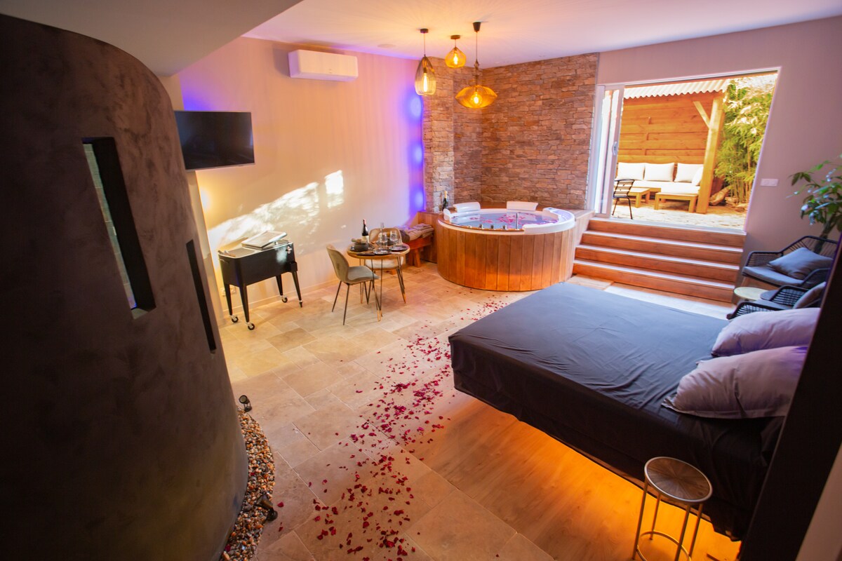 Neodvisen 58 m2 velik apartma v majhni mirni vasici v bližini jezera Salagou, St Guilhem le Désert, številnih drugih znamenitosti, ki jih lahko obiščete. Odkrijte zasebni slap, kromoterapijo in masažo pred veliko zakonsko posteljo. Elegantna in prefinjena dekoracija ter njegova igra luči vam bosta ponudila kokoniranje in sproščujoče vzdušje. Pridite in se sprostite za eno ali več noči. Idealno se nahaja 5 minut od vse opreme in trgovin.