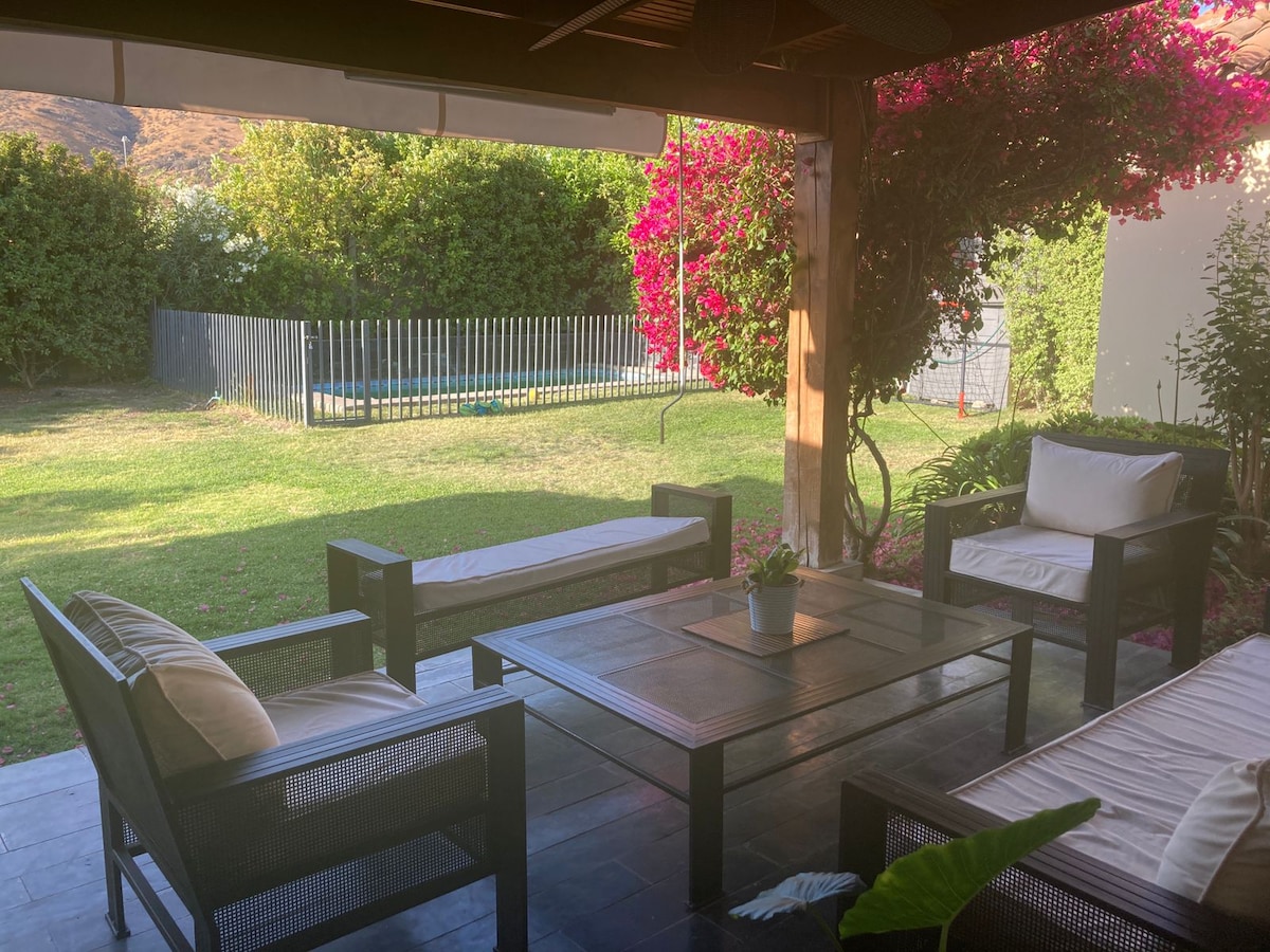 🏡 Hiša v zasebnem stanovanju z non stop nadzorom. Ima bazen, masažno kad, pokrit quincho, 3 spalnice (zakonska postelja, 2 od 1 bivališča in futon), 2 kopalnici z WC-jem in 1 kopalnico za goste. Kuhinja je opremljena s štedilnikom, lonci, grelnikom vode, oljem, soljo, sladkorjem in kavo. Vključuje rjuhe, brisače za prho in bazen, sušilnik za lase, šampon in milo. Klimatska naprava v glavni spalnici, velika televizija, Wi-Fi in parkirišče. Idealno za družinska potovanja. 🚫 Zabave ali dogodki niso dovoljeni.