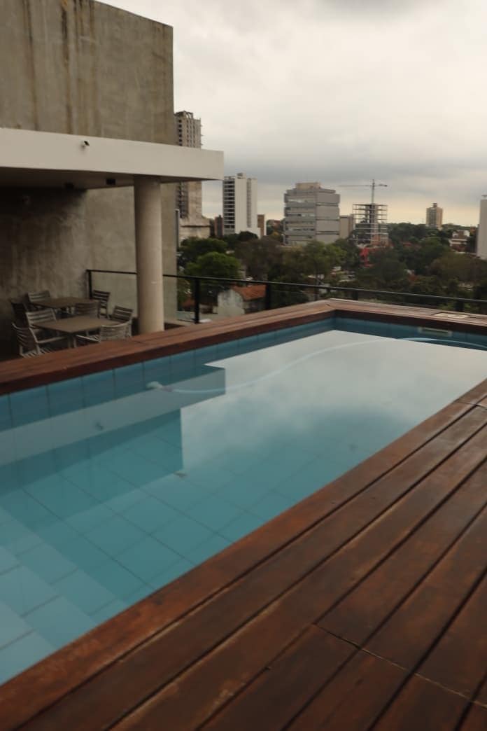 Odlično opremljeno luksuzno stanovanje. Velika zakonska postelja, pralni stroj, panoramski balkon z žarom, WiFi, pametni televizorji in miza s 27-palčnim monitorjem in UPS. Oprema kategorije: – Bazen in solarij - Ogrevan bazen - savna – telovadnica in strešna terasa - Quincho - Pralnica. - 24-urna varnost - Garaža Odlična lokacija v zelo varnem stanovanjskem območju: – 7 minut od poslovnega središča Corporate Axis, nakupovalnega središča del Sol in ulice Paseo La Galería – 10 minut od Costanere in mostu Héroes del Chaco - 15 minut od letališča