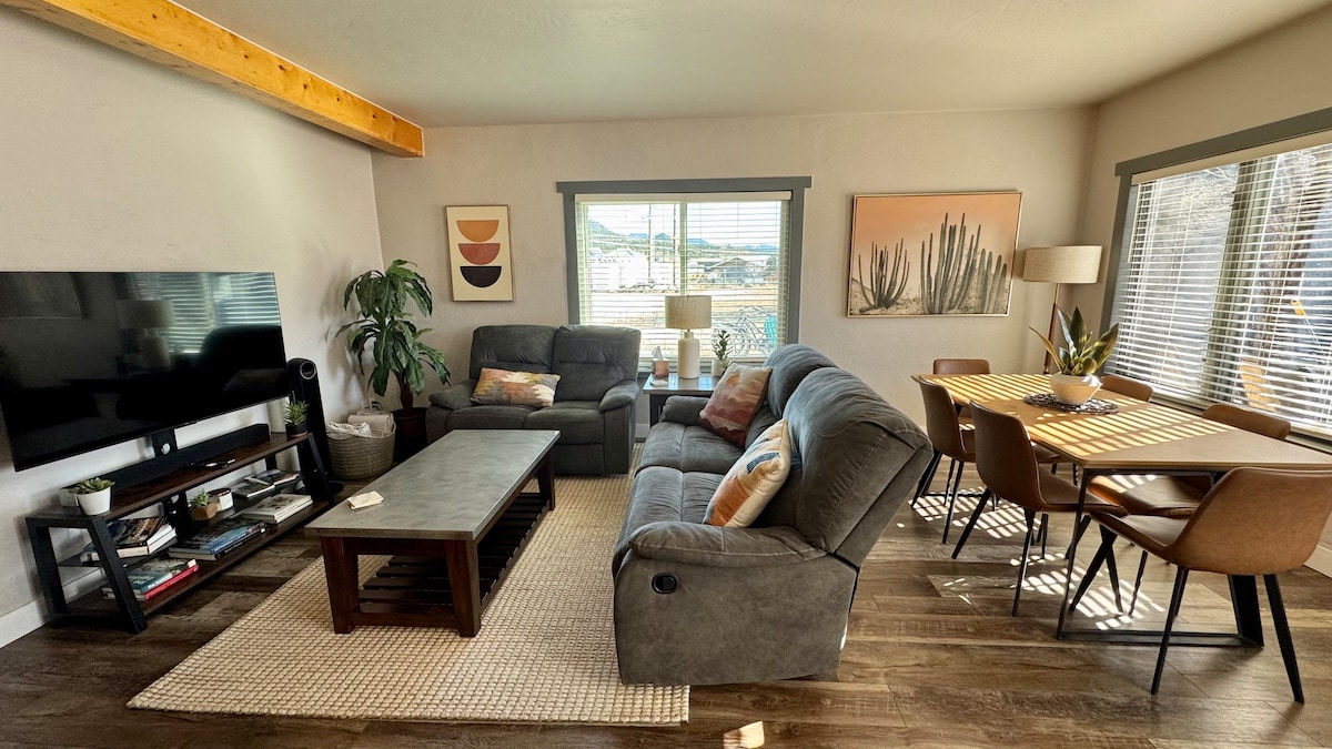 Ground level and PERFECT LOCATION! 2 BR/1 BA fully renovated condo a block from main street, a block to Arkansas River, 3 blocks to South Main. Professionally decorated, 65" TV w surround sound. Beautiful fire pit with mountain views. Leather power recliners. Upscale bedding and memory foam mattresses. Blackout “top down” blinds in all rooms. Soaking tub/shower with glass door. Keurig with pods. Fully equipped kitchen with deluxe cookware and small appliances.
