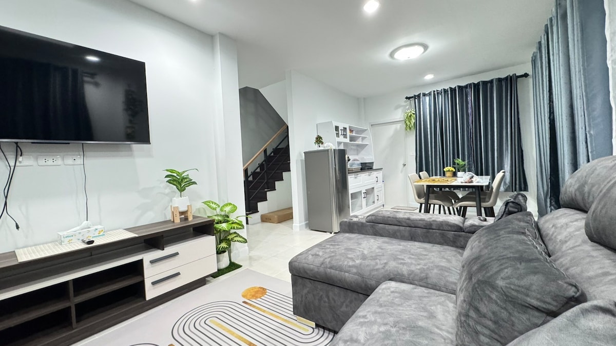 Stylish House Near the International Circuit This modern house is ideally located near Chang Arena (4.2 km), Chang Circuit Buriram (5.9 km), and Big C (1.5 km). The house: - Two high-quality bedrooms with comfortable queen-size beds - Two bathrooms - A living room - A fully equipped kitchen with a washing machine - 500 Mbps Wi-Fi and cable TV - Complimentary coffee and drinking water The two bedrooms are located on the SECOND floor, while downstairs you will find the living room and kitchen
