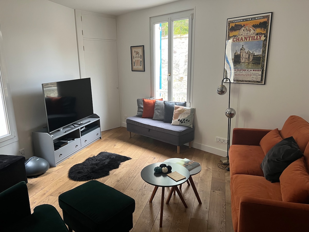 Prostorno (75 m2), svetlo, sodobno in dobro prezračeno, naše stanovanje se nahaja v drugem in zadnjem nadstropju zelo nedavne majhne zasebne stavbe s samo dvema enotama, kar vam zagotavlja mir in tišino. Manj kot minuto hoje od železniške postaje in gozda lahko počnete vse brez avtomobila: pridete do gradu, Grandes Écuries, dirkališča, restavracij, kina, tržnice... in celo do prvega puba, ki je oddaljen manj kot tri minute.