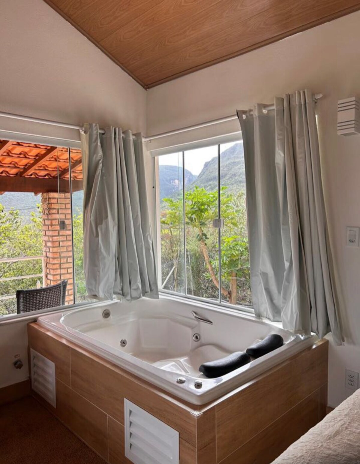 Udoben Chalé za 2 odrasla z obsežnim razgledom na gore in ekskluzivnim vrtom. Ima zasebni SPA (masažni bazen) planinskega doma, TV, klimatsko napravo, električno prho, Wi-Fi, naprave, pripomočke, delovno mesto, ležalnike, ognjišče, zunanjo mizo, žar, prho, parkirišče. Nahaja se v bližini Cachoeira da Fumaça (550 m od začetka poti), 2 km od vasi, tržnic v soseski (Campos) in restavracij. Oglejte si planinski dom 02: https://airbnb.com/h/chalesdotempo02
