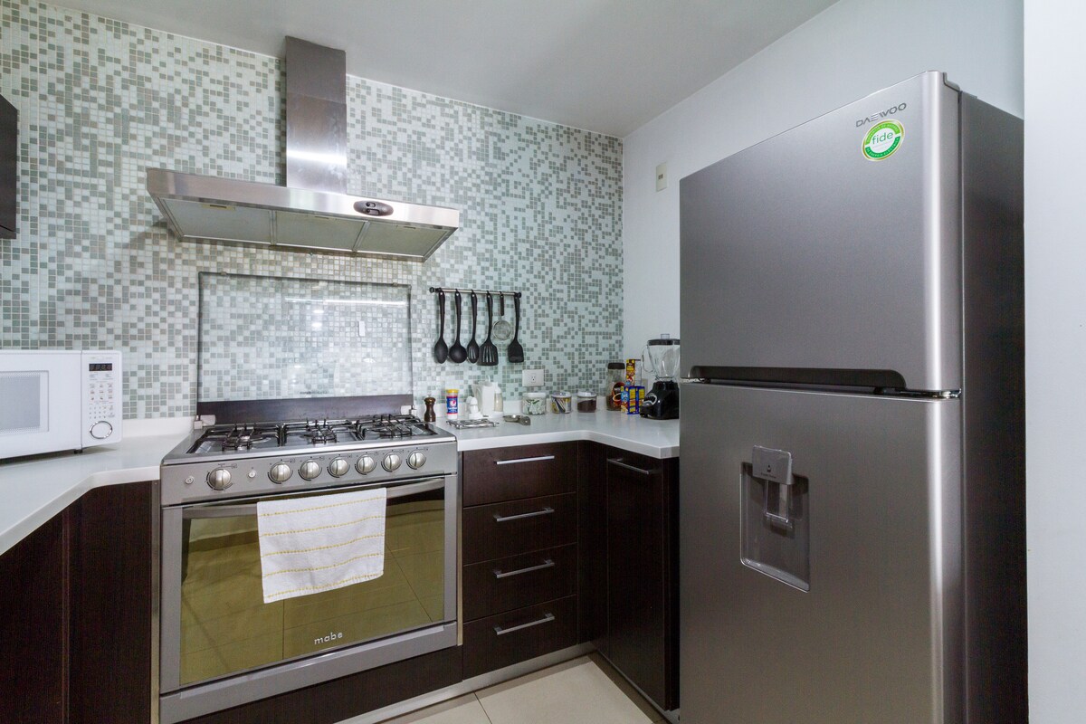 Very spacious home with two bedrooms (King and Queen), AC, smart lights, electric curtains, high speed internet Wi-Fi, Infinity pool, lounge area, roof garden and everything you need for a day or many months stay. The tower has a shopping area, top-notch restaurants, and it is walking distance from Landmark, Andares and Acueducto malls and The Colomos forest. We sanitize and clean the entire condo. Please read the rules before you reserve.