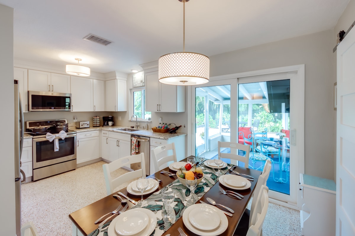 Eco-Friendly 2/2 Tropical Escape 🌿 Discover a home that loves the planet! This clean 2/2 for 4 guests focuses on sustainability. Vibe: Vinyl player, King/Queen beds & sunrise lamps. Full coffee/tea station included. Fun: 50 steps to the park & beach! Gear provided. Porch with sofa , grill & laundry. Area: Near Sarasota & Fort Myers for fishing, baseball & dining. Info: 4PM in/10AM out. One spot out front. 6 steps up. Pups welcome 🐾.
