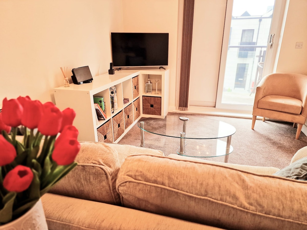 Odkrijte sodobno življenje v tem prostornem dvoposteljnem stanovanju, ki je idealno za poslovne potnike, pare in družine. Uživajte v razgledu na reko in zasebni terasi. Dnevni prostor odprtega tipa ima popolnoma opremljeno kuhinjo in eleganten dekor. Brezplačno parkiranje, dve plišasti postelji, hiter Wi-Fi, namenski delovni prostor in ogromen 80-palčni televizor. To stanovanje se nahaja le nekaj trenutkov stran od najboljših restavracij, kavarn in kulturnih znamenitosti na ulici Chapel Street ter ponuja udobje in priročnost za vaše bivanje v Manchestru.
