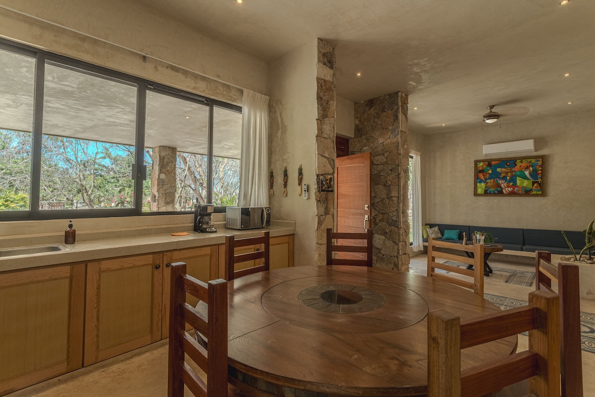 Uživajte v lepoti in miru plaže Telchac v naši rustikalni hiši v tropskem slogu. Hiša je le nekaj minut stran od mesta, kjer lahko najdete več tradicionalnih restavracij in majhnih trgovin. Ponuja osupljiv pogled na ocean in je obdana s palmami, ki ustvarjajo sproščujoče in osvežujoče vzdušje - kot nalašč za branje knjige, meditacijo ali preprosto zadrejanje. Ne zamudite priložnosti, da preživite poživljajoč konec tedna v Telchacu!