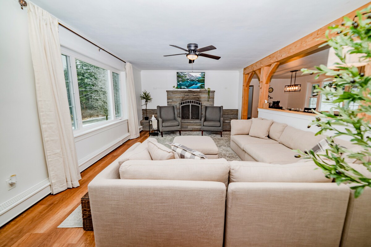 Umik, osamljen oddih, vendar v bližini mesta. Udobna koča je rustikalna z nekaj elegantnega pridiha, dekoracijo in nedavnimi posodobitvami. Zasebno se nahaja na 2 gozdnatih hektarjih in v bližini mesta. 2 kamnita kamina, notranja masažna kad, 2 1/2 BA, 3-4 BR & 7 oseba zunanja masažna kad. Odličen WI-FI, kuhinja in jedilnica. Piknik, žar in ognjišče. Odlično jesensko listje, blizu smučišča, v bližini pohodništva, izstrelitve čolna. V celoti opremljeni, samo pripeljite se!! Pripravljeni sprejeti goste - vprašajte!!