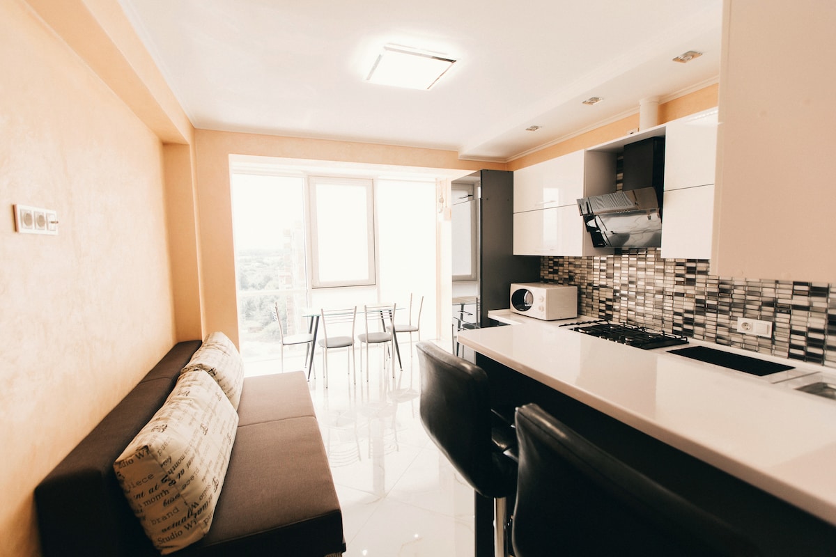 Stanovanje se nahaja v novi stavbi v osrčju mesta v bližini avtobusne postaje. Priročna lokacija vam omogoča, da hitro pridete do glavnih znamenitosti. Hiša ima priročno parkiranje in video nadzor. Stanovanje ima vso opremo za udobno bivanje. Obstajata dva panoramska balkona z odličnim razgledom.
