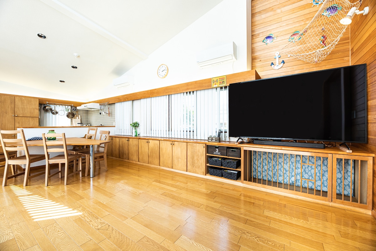 VAMOS A VER is a spacious 133㎡ private house, conveniently located just a 15-minute walk from Onjuku Station and only 5 minutes from the beach. The comfortable living room features a large 75-inch TV, where you can enjoy not only local channels but also Netflix and YouTube. To make your stay even more convenient, we offer 2 complimentary electric bicycles, perfect for getting around the station area and nearby attractions.
