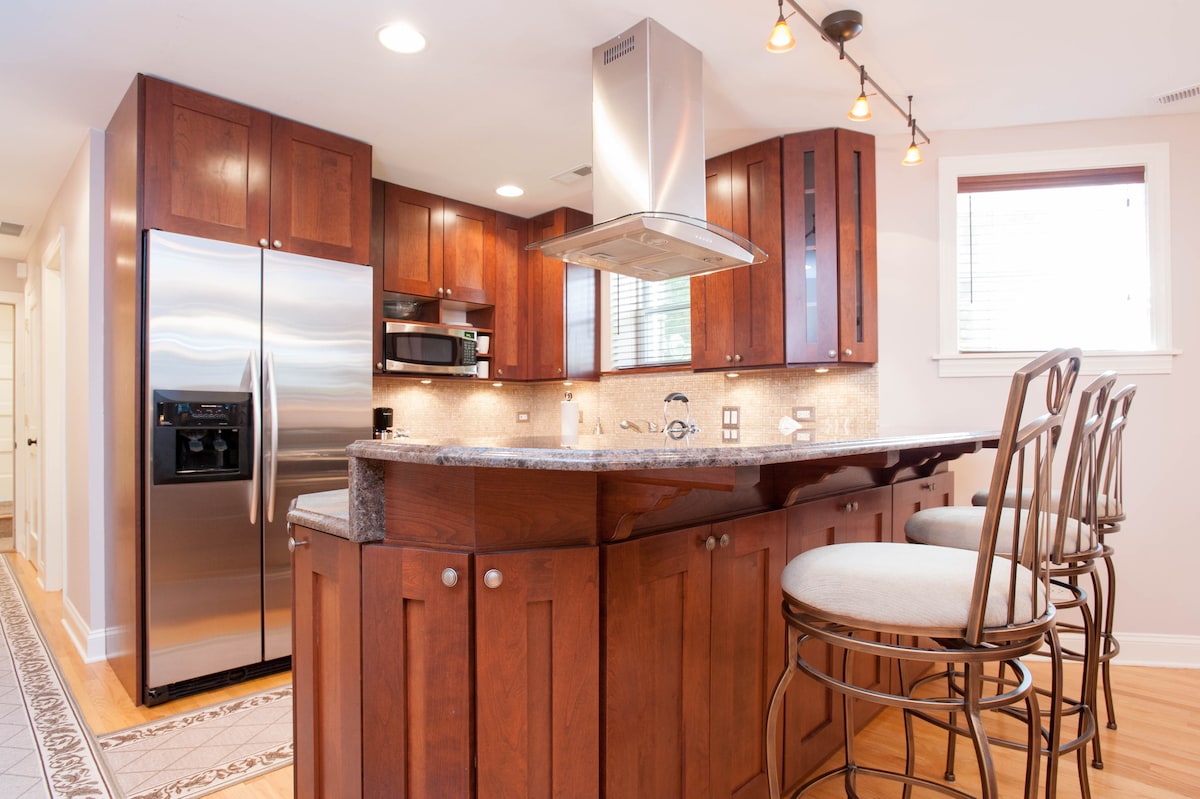 Velik prostor z 1 spalnico je okusno urejen in dobro opremljen. Za 4 osebe (5 oseb z napihljivim napihljivim prostorom). Zakonska postelja v BR, futon v polni velikosti v LR. Dovolj prostoren za 2 osebi, da lahko udobno delata. Uporaba terase, ognjišča in žara. Nahaja se na živahnem Lincoln Squareu. Koraki do postaje Rockwell Brown Line el, restavracij, pekarne in studia za jogo/masažo. Nekaj ulic stran so trgovine, restavracije in kino! Enostavno parkiranje na ulici z brezplačnimi dovoljenji. Na voljo je polnilnik za električna vozila 2. stopnje.