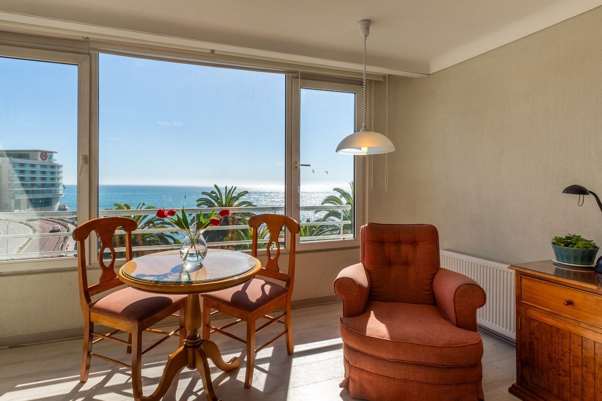 Departamento tipo estudio, con hermosa vista al mar. Cuenta con cocina, cama king, conexión wifi, TV cable y todo el equipamiento necesario para un cómodo descanso. Ubicación privilegiada, a orilla de playa, a 300 metros aproximadamente del reloj de flores y de playa Caleta Abarca, cuenta con estacionamiento bajo techo. Con disponibilidad para el uso de áreas comunes: piscina y lavandería Ideal para ver el atardecer de forma única