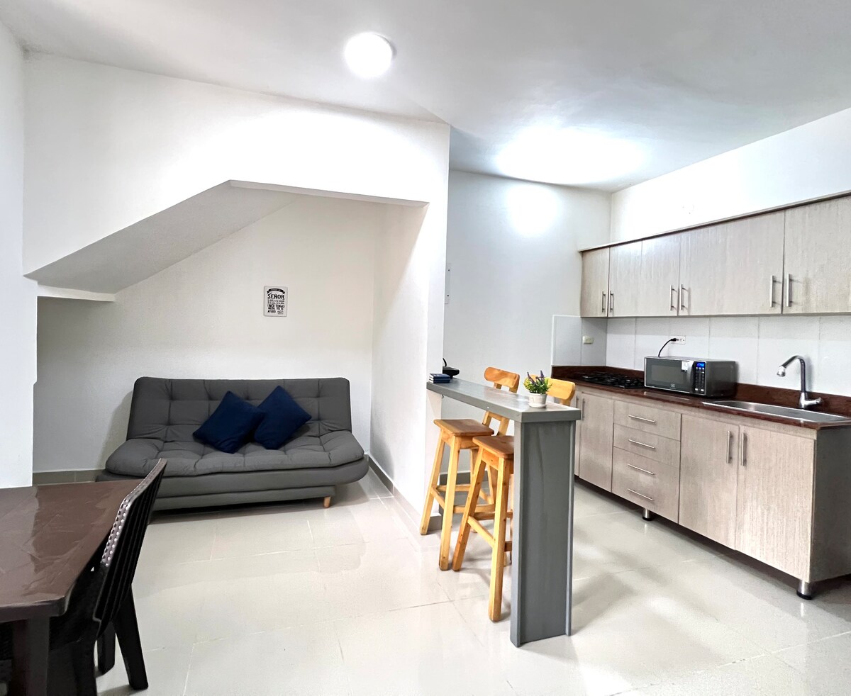 Disfruta de la sencillez de este alojamiento tranquilo y céntrico. con dos habitaciones y 2 baños alcoba principal cama doble, la otra cama.doble y cama sencilla, agua caliente, aire, terraza con barbikiu y wifi