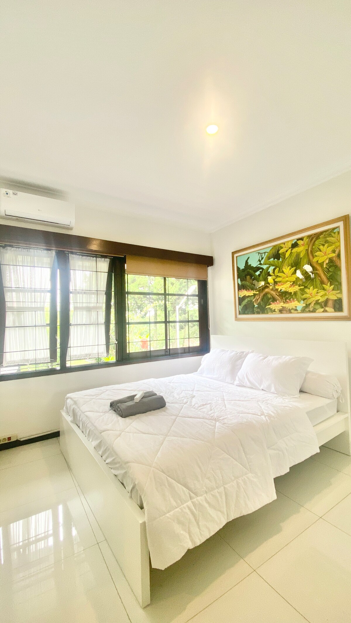 Comfortable 2-storey house in East Bandung, has 2 bedrooms + extra bed, 2 bathrooms, 3 AC units (living room & bedroom). Apart from that, the location of our house is only 10 minutes from KCIC Tegalluar Station, Summarecon Mall, Al Jabbar Mosque, and many more, as are several facilities as below: -Smart Lock -Wifi -Smart TV - Carport for 2 cars -1 Water Heater Unit -Hair Dryer -Iron -Microwave -Dispensers -Rice Cooker -Plates and cooking utensils