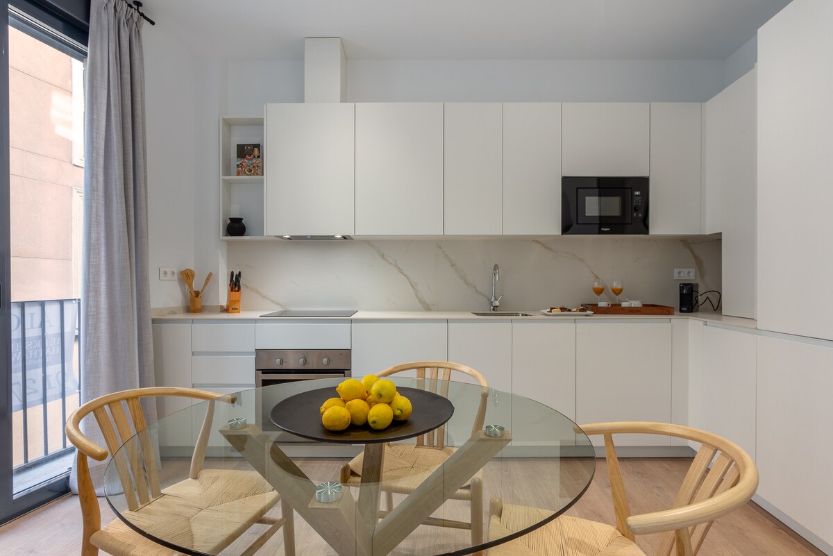 Magnificent 45 square meter apartment in the heart of Madrid. With spectacular design and decoration, spacious areas, and high ceilings, the apartment is equipped with everything you need for your stay in Madrid. The living room has three balconies overlooking the street that provide great brightness to the flat. The bedroom has an en-suite bathroom and a work desk. From the apartment, you can walk to almost all the iconic points of Madrid.