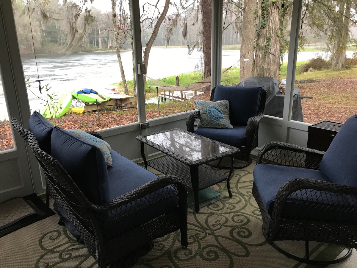 Peaceful, pet-free 4/3 family getaway or work retreat on the a quiet part of the Rainbow River. Nestled in nature but minutes from restaurants, grocery and antique stores. Relax on the dock, expansive deck, screened porches or around a camp fire. Abundant outdoor activities including tubing, paddling, fishing, snorkeling, biking, etc. Pls note, 10 people max. For parties of 7+, there is a fee to unlock the 4th bedroom. No pets, no smoking, no parties or events.